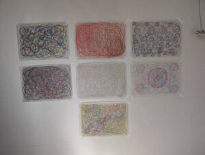 クレヨンで画用紙に、曲線をたくさん描きました。この3ヶ月間を思いながらということでした。きれいに描こうとかでなく気持ちを出していくようにということで、この作品ができました。