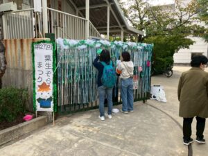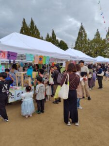 午前10時30分、「粟生ぞらまつり」スタートです。開始を待ちかねた子どもたちがお店を回って、商品を吟味したりゲームを楽しんだり。