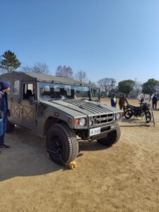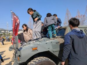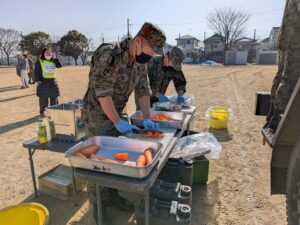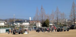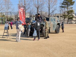 東小グラウンドでは、陸上自衛隊伊丹駐屯地の隊員の方による自衛隊車両の展示や救命訓練、カレーの炊き出しなどをしていただきました。