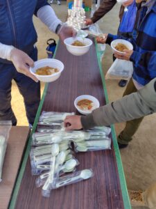 当日は寒中とは思えないほどの暖かい晴天となり、グラウンドには多くの参加者が見られました。やはりお目当ては「自衛隊のカレー」です。出来上がりを待つ長い行列ができていました。