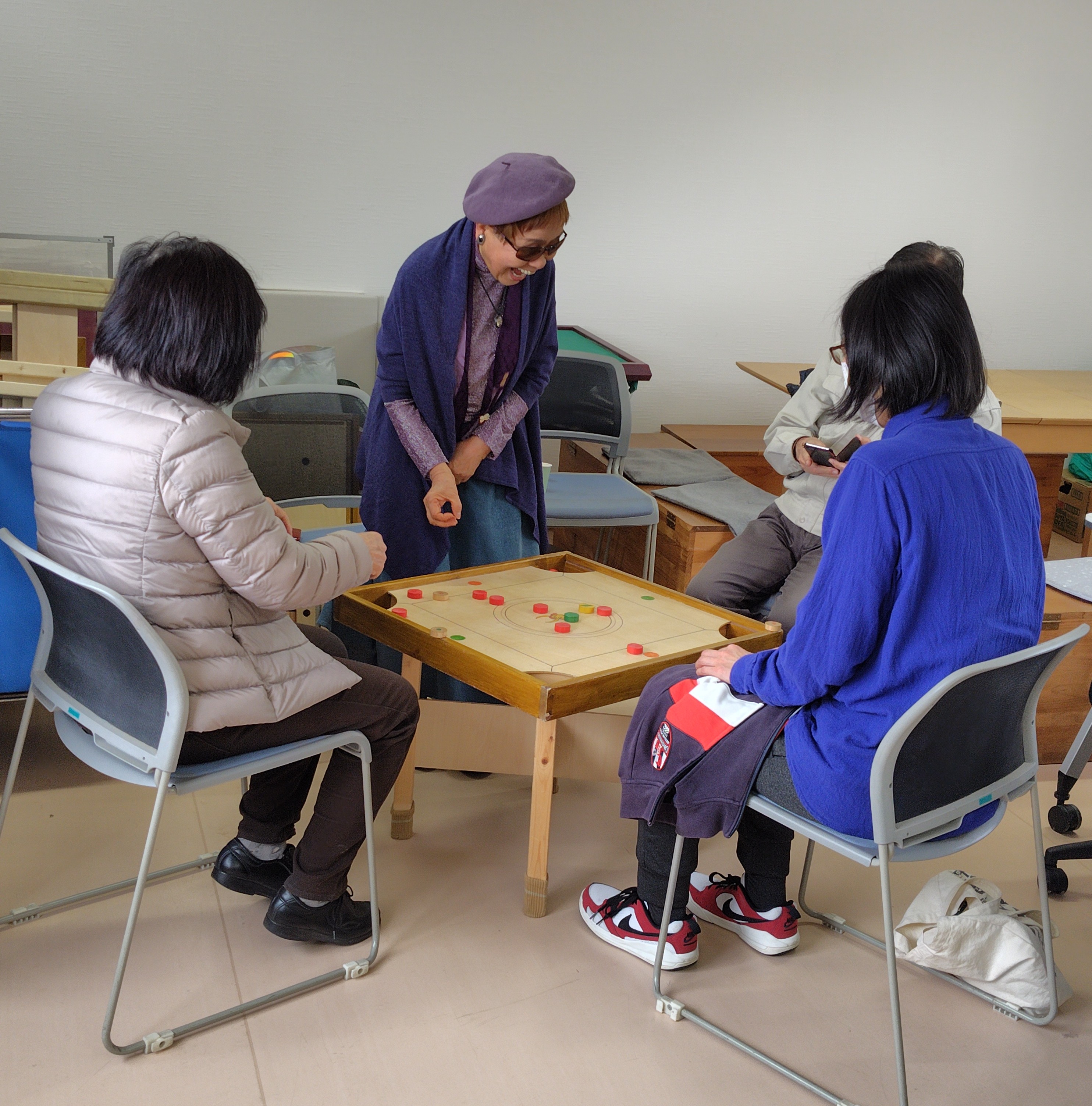 2月26日(木)お茶の間えみぃが開催されました。今回のゲストは3名。こちらではボードゲームの「カロム」や「オセロ」を楽しみました。指導される方と一緒にゲームを進めながらルールを覚えていきます。ルールといっても難しくはなく、おはじきとビリヤードが混ざったようなゲームです。全くの初心者です!とおっしゃった方もあっという間にゲームを楽しめるようになりました。