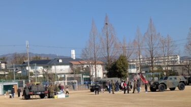 1月17日(土)10:00より、箕面市全地域で一斉に防災訓練が実施されました。東小校区では校区内の自治会を中心に「黄色いハンカチ」作戦を行い、東小に集合しました。東小グラウンドでは、陸上自衛隊伊丹駐屯地の隊員の方による自衛隊車両の展示や救命...