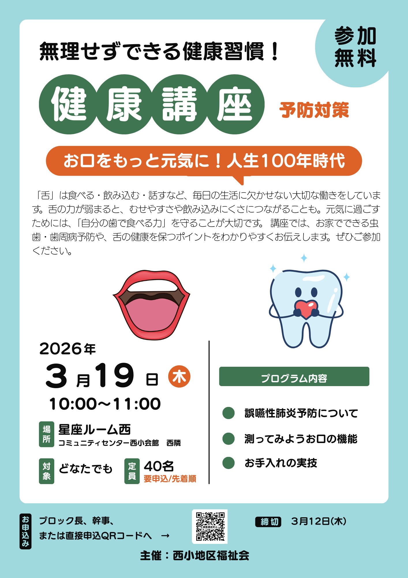 お口をもっと元気に!健康講座参加者募集 イベント 2026.02.08 健康講座のご案内です 3月19日(木)10:00~11:00 星座ルーム西 ぜひご参加ください 申込はこちらから → https://forms.gle/LpRuv6wd1FzMfmhu6